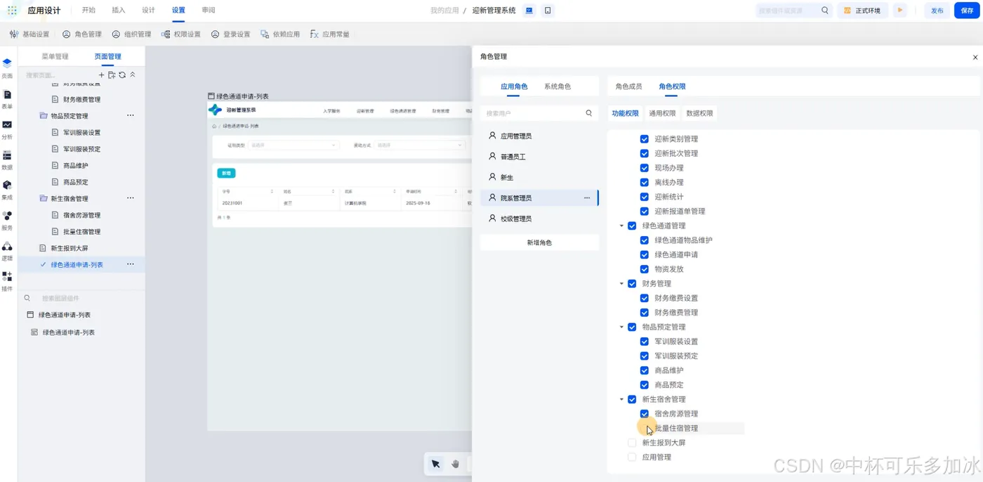 权限配置中,我们给新生只开了 “个人申请查看”“申请提交” 的权限 —— 也就是说,新生登录后只能看到自己的申请记录,看不到别人的,保证数据隐私;给院系管理员和校级管理员开了 “全部申请查看”的权限,方便统筹所有申请。设置好后点 “保存”,立刻生效,不用重启系统。