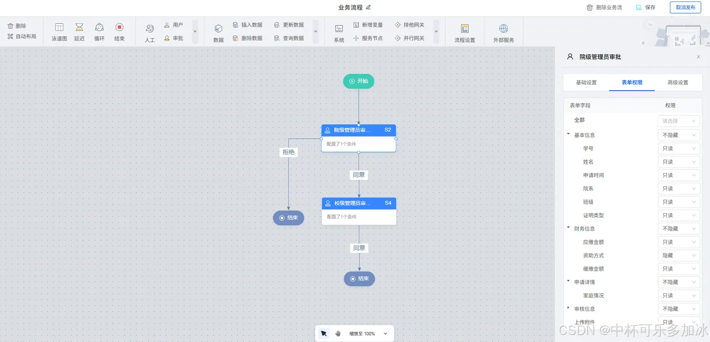 拖拽 “开始节点”“审批节点”“结束节点” 搭建流程:设置 “开始节点” 绑定新生角色及表单操作权限;添加 “审批节点” 分别绑定院系管理员、校级管理员角色,配置审批权限(查看 / 编辑意见、同意 / 拒绝操作),并设定 “院系拒绝则流程终止,同意则流转至校级终审” 的规则。