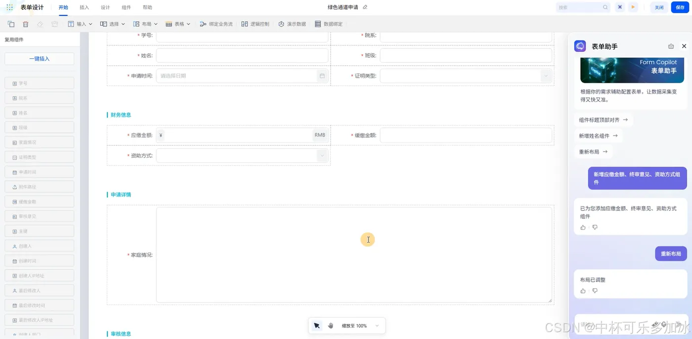 先处理绿色通道的表单,进入表单设计界面,点击【表单助手】,输入 “新增应缴金额、终审意见、资助方式组件”,点击 “重新布局”,助手会自动把这三个组件加到表单里,还会智能调整位置。