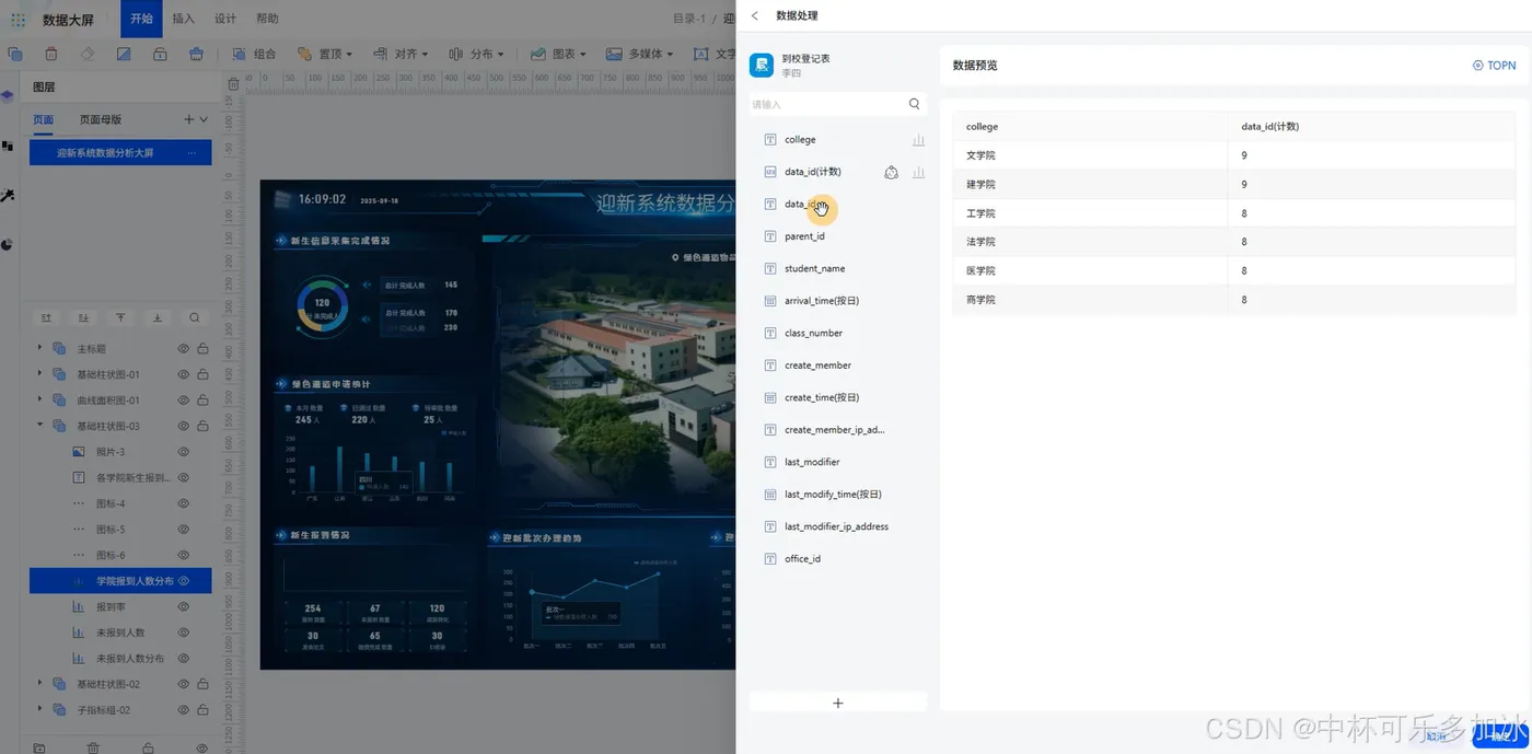 在图表上选择 “数据绑定”,选系统里的 “到校登记表”,再把 “报到人数”“院系” 这些字段对应上,大屏就会实时同步数据,迎新现场挂在大屏幕上,管理人员扫一眼就知道整体进度。