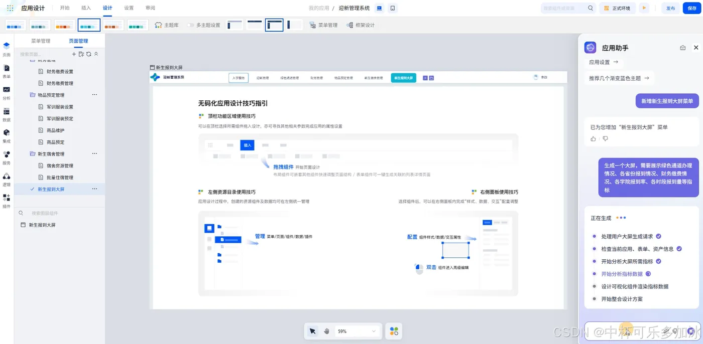 然后是加功能,迎新现场目前还缺少的就是 “新生报到数据大屏”—— 管理人员得实时知道多少人已报到、哪个院系进度慢。于是在助手里输入 “新增新生报到大屏菜单页”,自动生成菜单与空白页;继续输入需展示的核心数据,AI 会自动生成含图表、数字卡片的可视化大屏,连颜色都搭配得很协调。