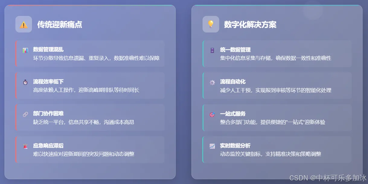 - 优化服务体验:整合入学服务、绿色通道等功能,提供“一站式”迎新服务,避免多平台切换;