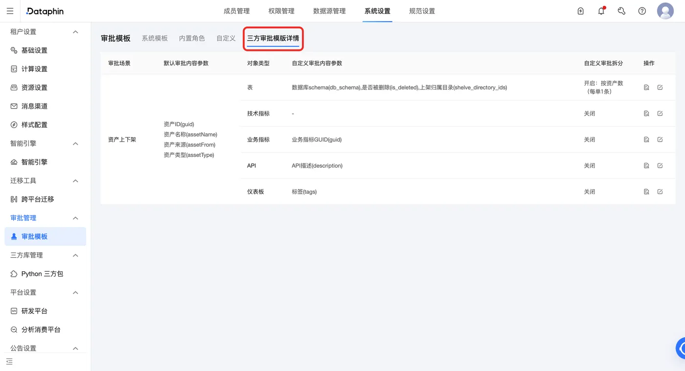 - 当对接了三方审批系统时,可自定义资产上下架审批任务的内容详情参数,选择需要传递的资产属性,实现与企业 OA 系统的无缝协同。