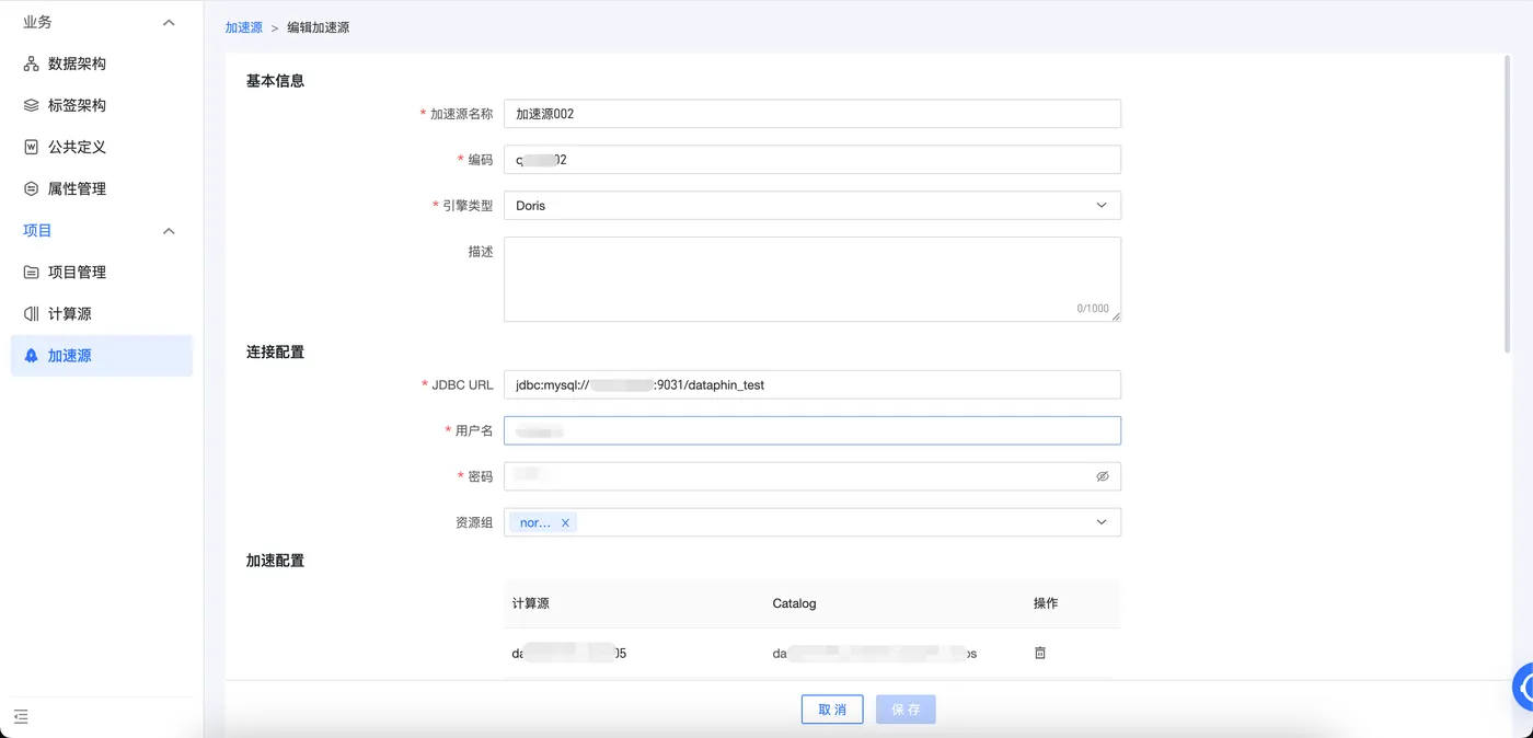 - 创建加速源(支持 StarRocks、Doris、SelectDB),配置计算源(MaxCompute)或Hadoop集群(Hadoop)与加速源中外部Catalog的映射关系