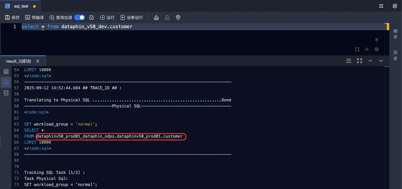 - 开启查询加速,使用加速源,原始SQL会被转译为加速源的SQL,通过加速源外部 Catalog 的方式访问Hadoop或MaxCompute中的原始数据,且遵循在 Dataphin 中针对 MaxCompute 和 Hadoop 对象的权限设置。