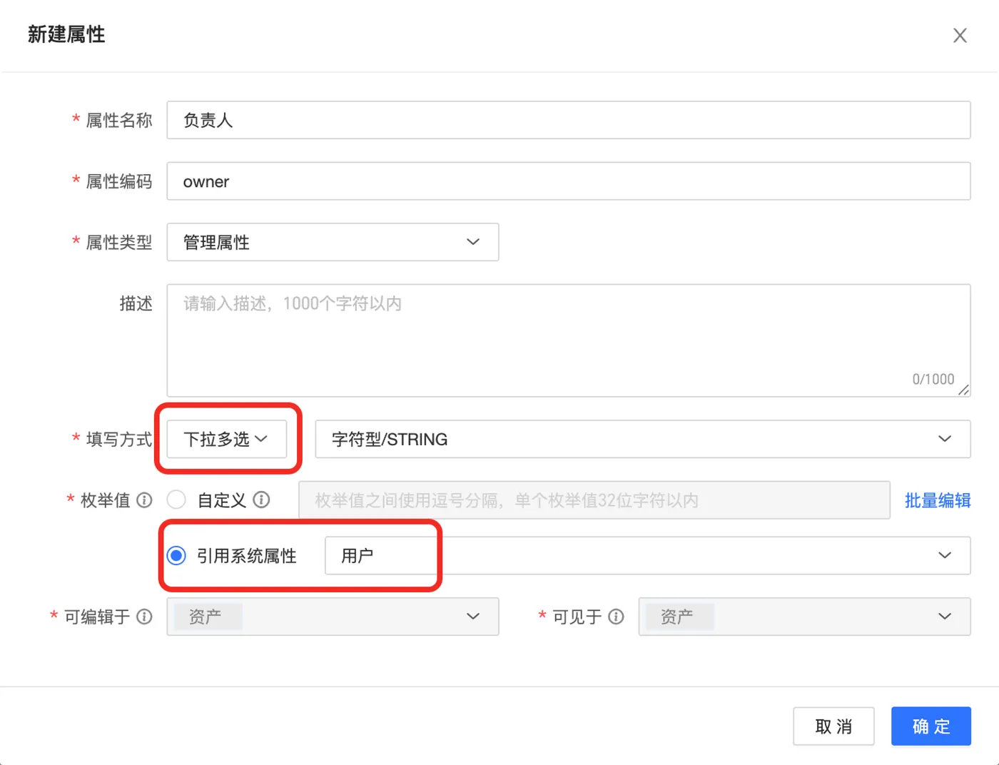 - 针对下拉单选、下拉多选属性,枚举选项来源新增支持引用系统属性(如用户/用户组、主题域、部门)。