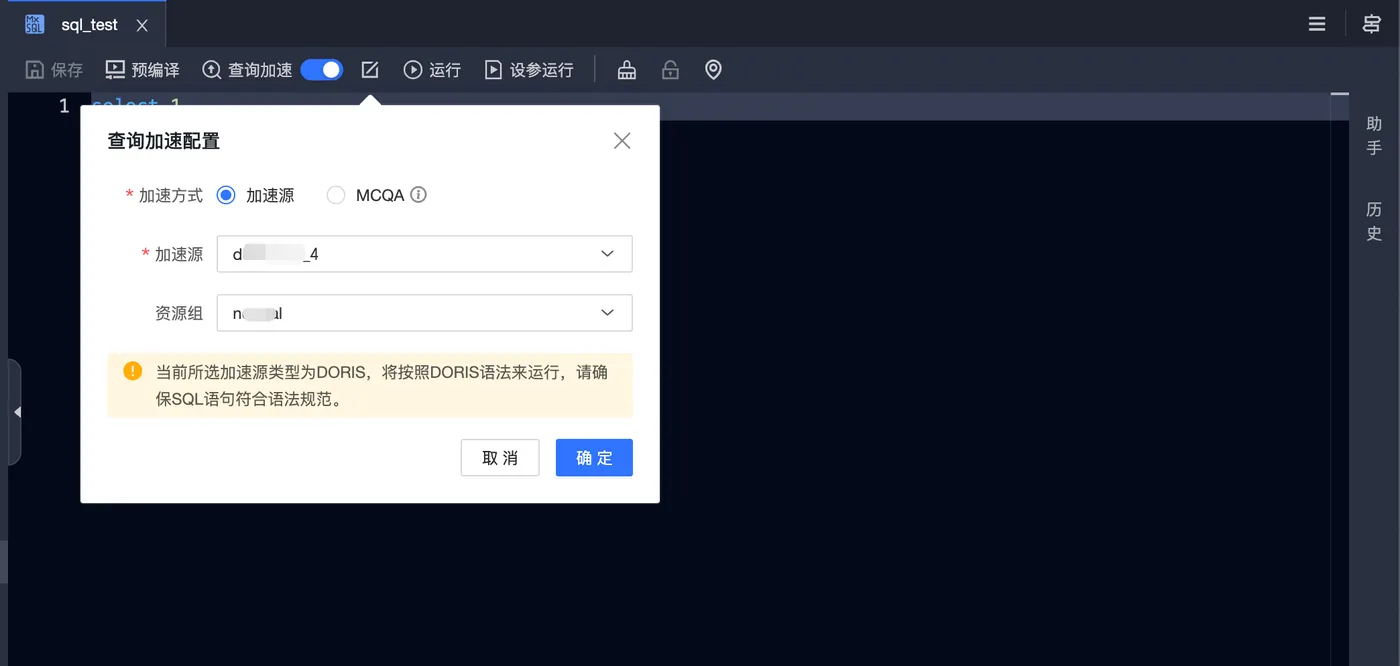 - 在即席查询中开启查询加速,可以选择加速源进行加速