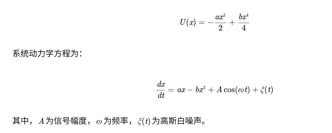 随机共振是非线性系统中,输入信号、噪声和系统参数协同作用,使输出信噪比随噪声强度增加而增大的现象。传统SR模型采用双稳态势函数: