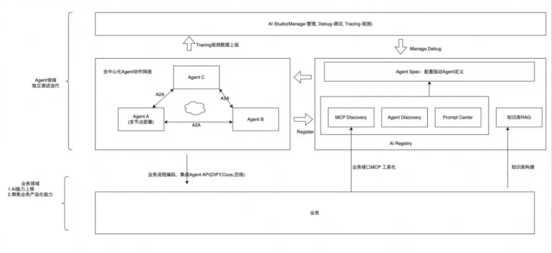 在多Agent在A2A协议构建的标准化通信基础之上,动态治理的能力得以真正释放。其最终愿景是:将传统微服务的业务能力,通过构建知识库、并将业务接口以MCP协议封装,注册到MCP Registry中,使Agent能够像调用普通工具一样动态调用核心业务功能。 随着Agent能力的不断增强,传统业务系统的逻辑和决策权逐渐“上移”到Agent侧,最终实现业务云(Business Cloud) 与智能体云(Agent Cloud) 的高效协同与并行演进。