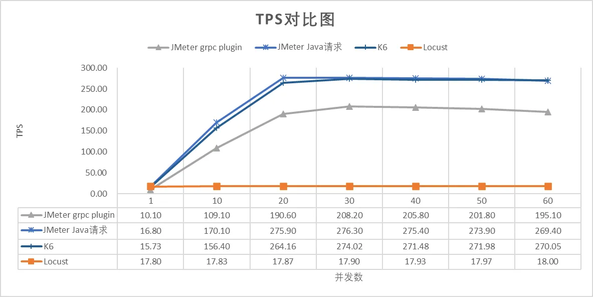 比较发现JMeter Java请求方式和K6的方式得到的TPS基本相同,只有0.72%的差距。不过K6的方式在低并发时TPS会比JMeter Java请求的方式要少一些,并发增大后,差距基本就没有了。使用JMeter grpc plugin的方式的话就会有24.65%的较大差距。而使用Locust的话,可能当前Python调用gRPC方式并没有实现真正的并发,暂时没有进行针对性的研究(如果有大神指点一下的话非常感谢)。