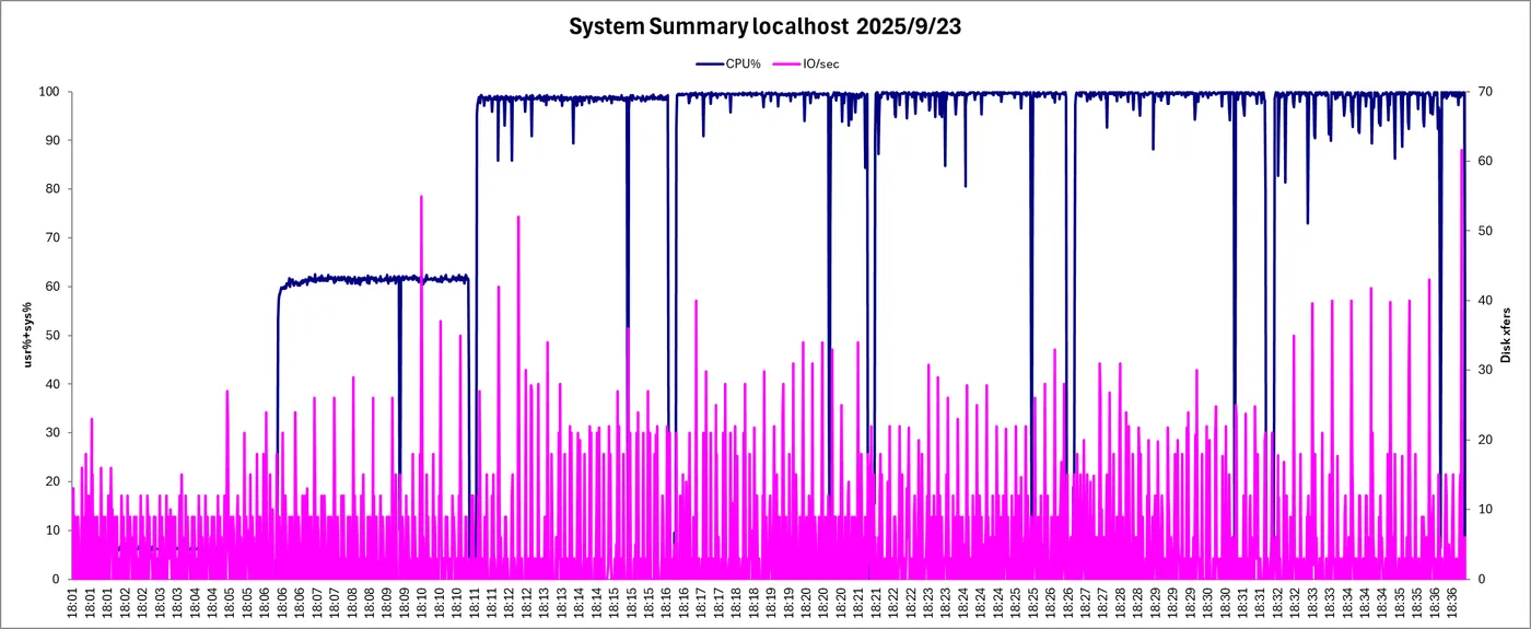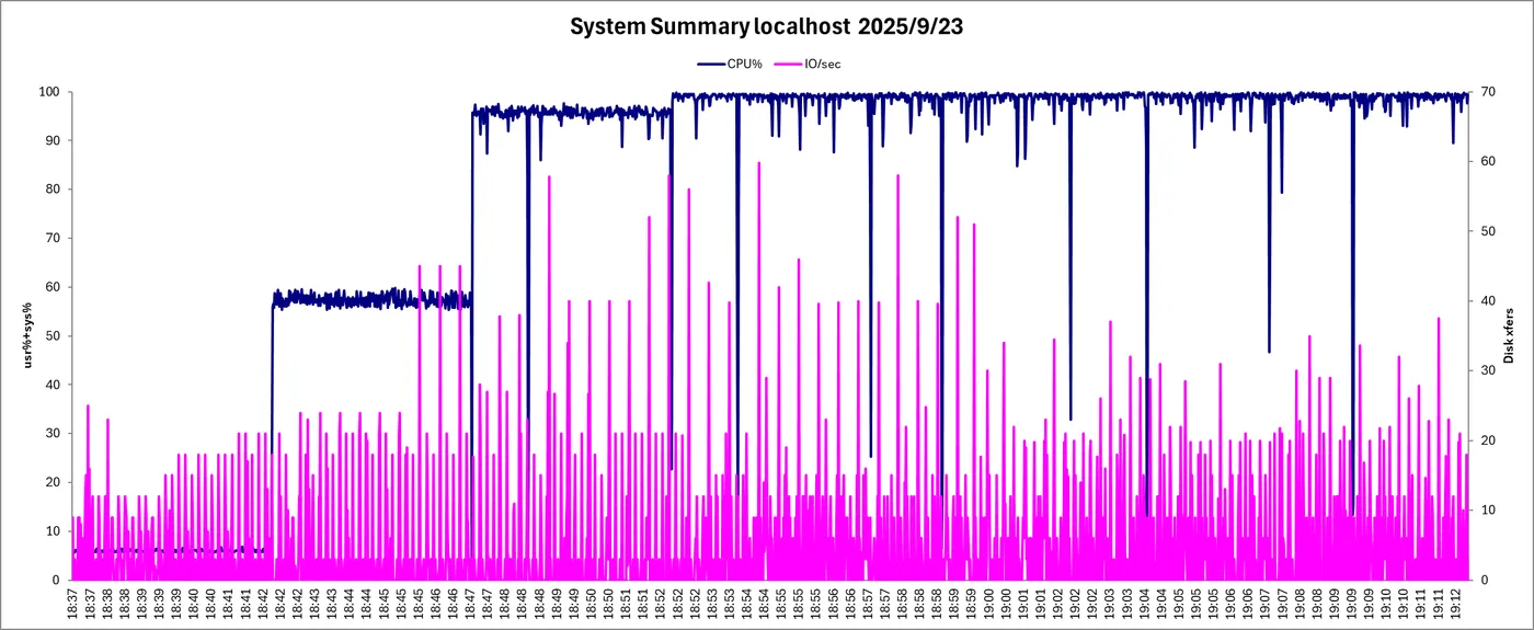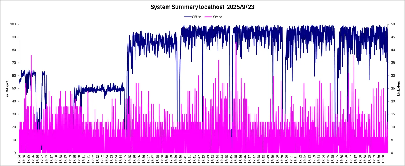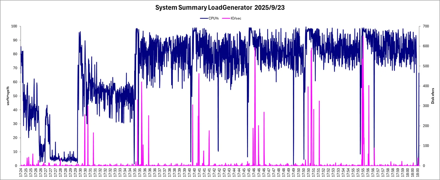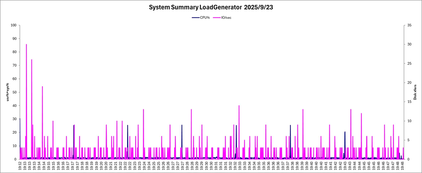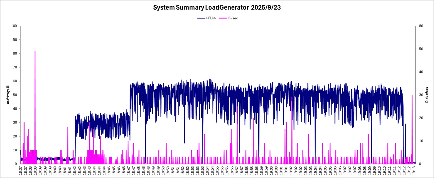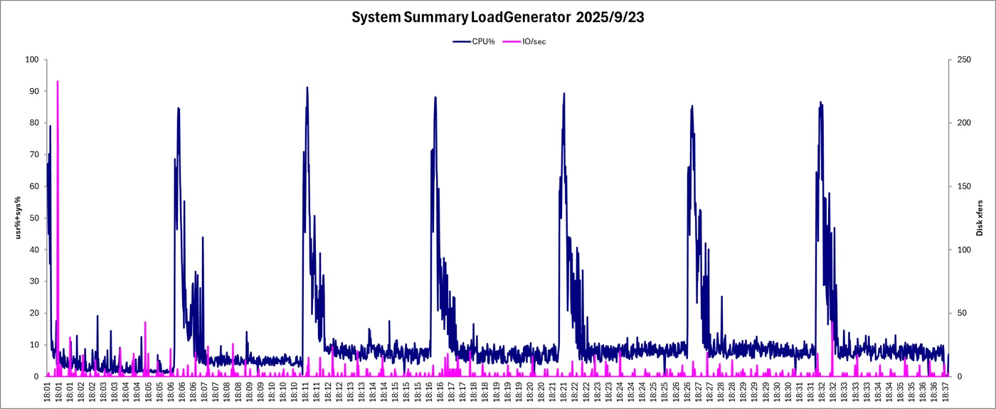 通过以上几张图可以发现,使用JMeter Java request的方式可以使服务器的CPU持续运行在高位,相对波动最少。其次是K6的方式,服务CPU使用也很稳定,但在低并发时,CPU使用率会比JMeter Java request的方式略低,并且会有少量较大的使用率波动。使用JMeter grpc plugin的方式也能使服务器CPU在较高水平运行,但是有持续的波动,不会稳定维持在高位。Locust明显没有给服务增加并发压力,一直保持在单线程的水准。