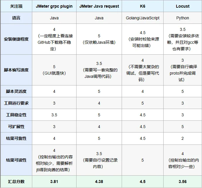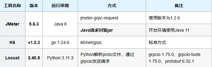 由于工作的原因,平时需要对服务的gRPC接口进行测试。之前一直使用JMeter编写Java请求的方式来测试的,但一直不清楚这种方式有什么局限。最近有时间看一些其他常用的性能测试工具(包括K6、locust),但发现网上的资料大多是http请求相关的。于是决定针对gRPC的请求进行一组简单的测试,计划从:脚本的维护难度、工具的资源占用、能支撑的并发数量和结果输出的完整性等方面进行比较。