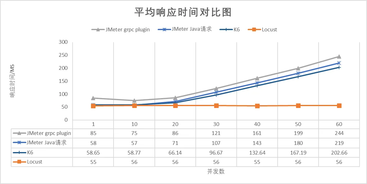 测试过程中依次增加10并发至60并发,每次运行5分钟,收集结果如下: