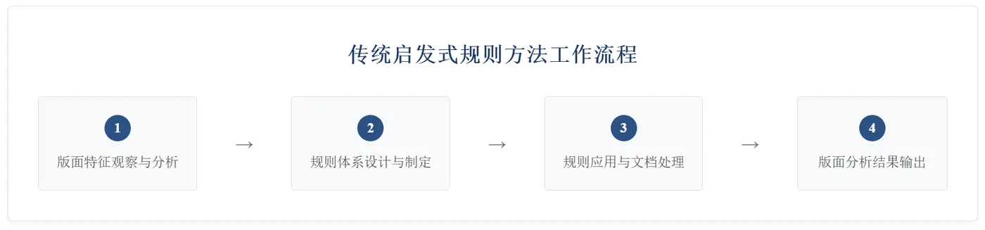 其中,启发式规则方法通过观察版面特征来制定特定规则,适用于固定格式的文档,但其缺点是劳动密集型,且泛化能力差,难以适应历史文献的多样性。