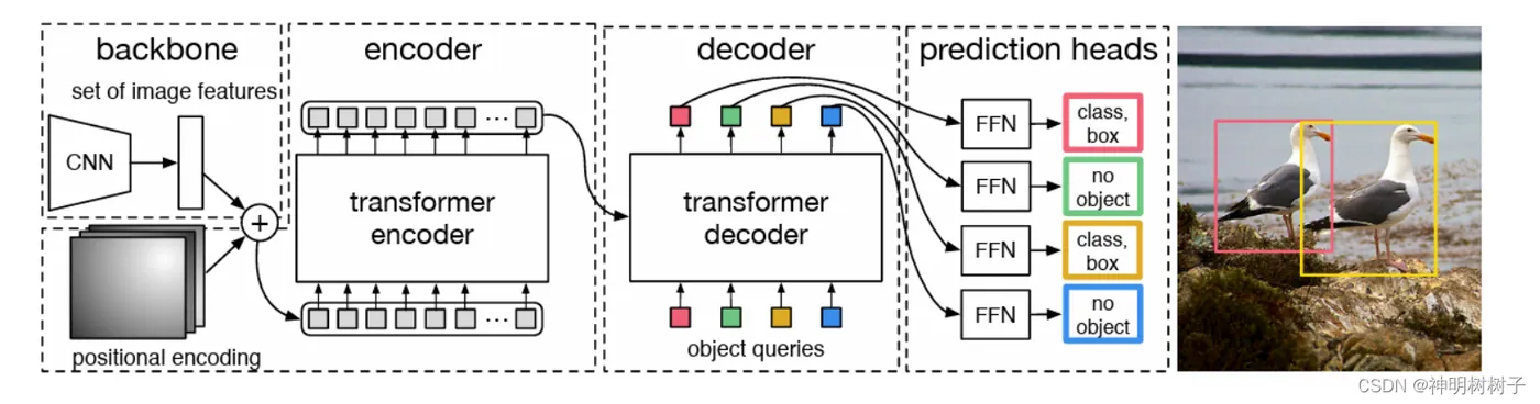 2020年,Facebook提出了一个DETR模型,首次将 Transformer 架构引入目标检测,并实现了一个真正的端到端流程,模型的主要结构如下: