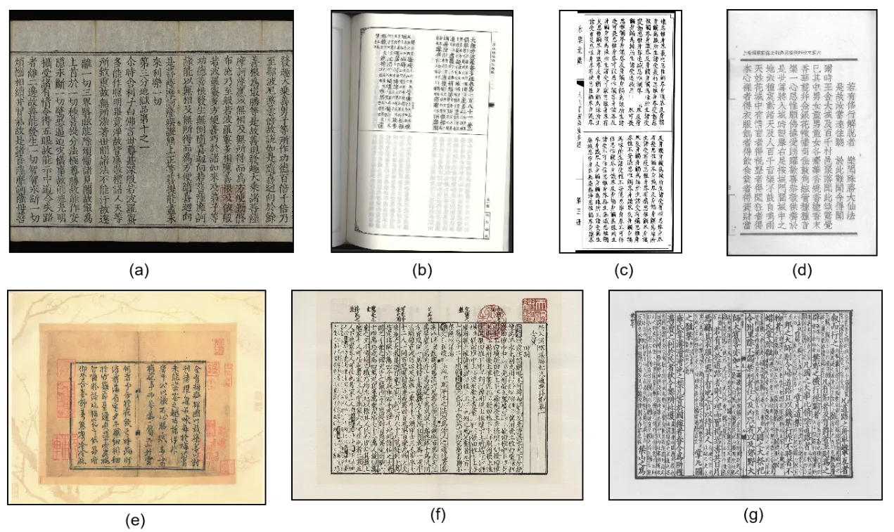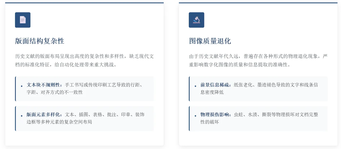 历史文献是中华文明的瑰宝,也是记录人类文明发展的重要载体。然而,这些文献通常具有复杂的结构和多样的排版风格,且常因年代久远而出现字迹模糊、纸张破损等现象。这使得对其的数字化和智能化利用面临着一系列独特的、远超现代文档的挑战,与现代文档的标准化排版不同,历史文献的版面结构往往高度复杂且缺乏统一规范,包括但不限于: