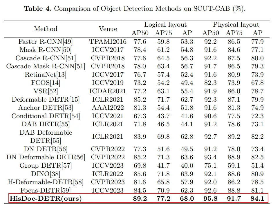 为精确衡量HisDoc-DETR在版面元素检测任务中的表现,文章还在公开中文历史文献版面分析数据集 SCUT-CAB 上进行了严格且丰富实验验证对比,结果显示,HisDoc-DETR在所有关键评估指标上均取得了SOTA。