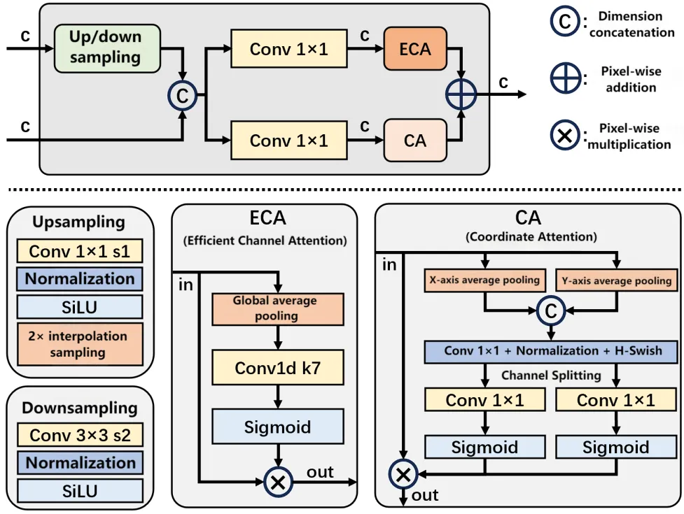 - 粗融合与细融合:首先通过初步的通道拼接实现特征粗融合。在此基础上,模块进一步引入了高效通道注意力(ECA)和坐标注意力(CA)机制。ECA关注特征图中不同通道的重要性,而CA则关注特征图中不同空间位置的重要性。通过学习这些注意力特征图,并进行逐像素相加,实现了高层语义信息与低层细节信息的深度融合,生成了一个充分整合的多尺度特征图。这种精细的融合方式,使得模型在识别不同尺寸和形状的版面元素时更加准确,尤其对于历史文献中可能出现的微小或不规则的元素,能够提供更强的感知能力。