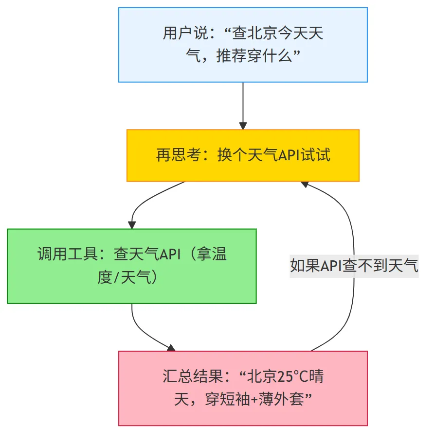 (5) 有问题再调整:如果API查不到天气,会自动换另一个工具再试。