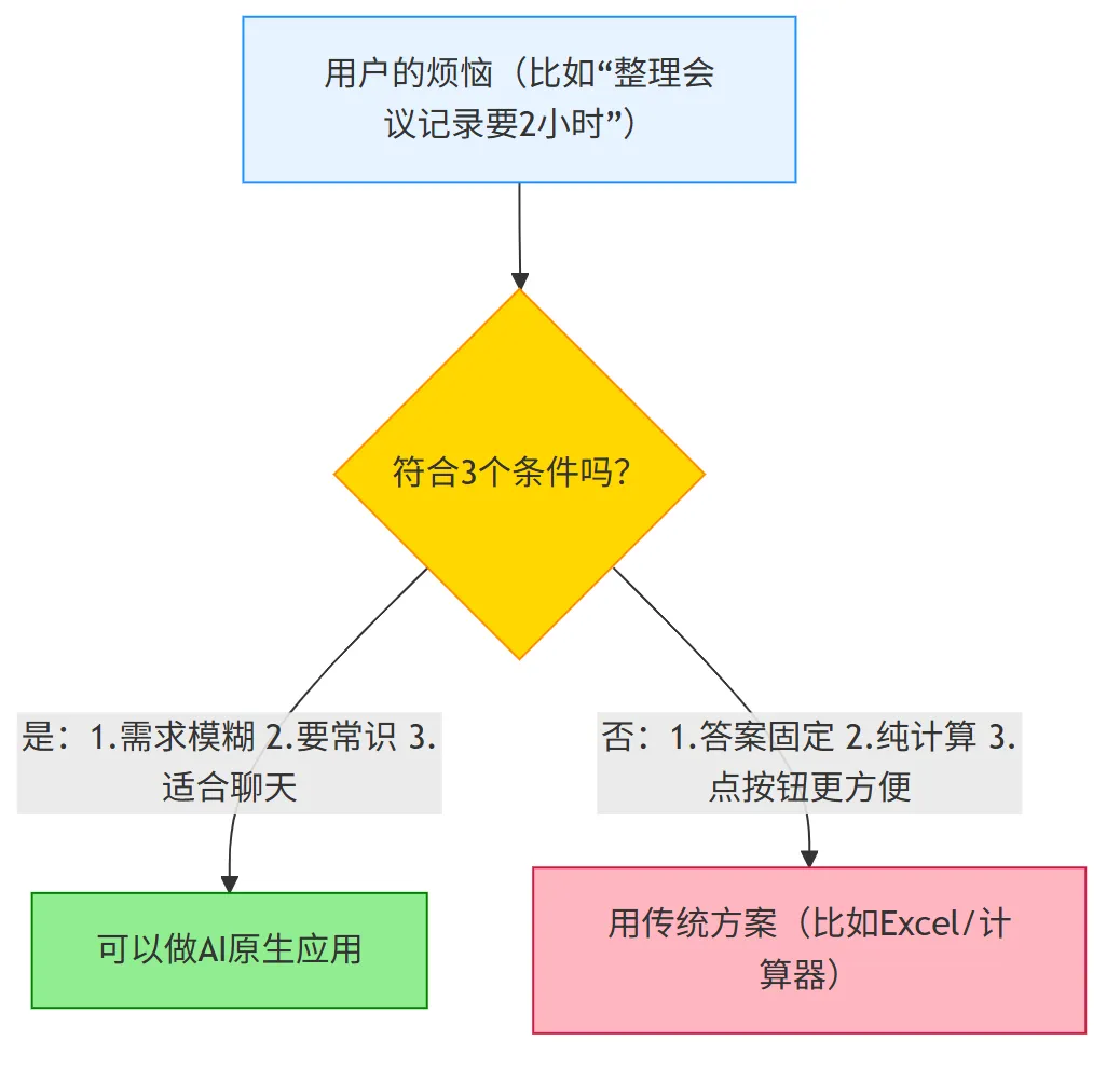 比如“整理会议记录”符合所有条件,适合做AI原生应用;“算房租”不符合(纯计算),用Excel更简单。