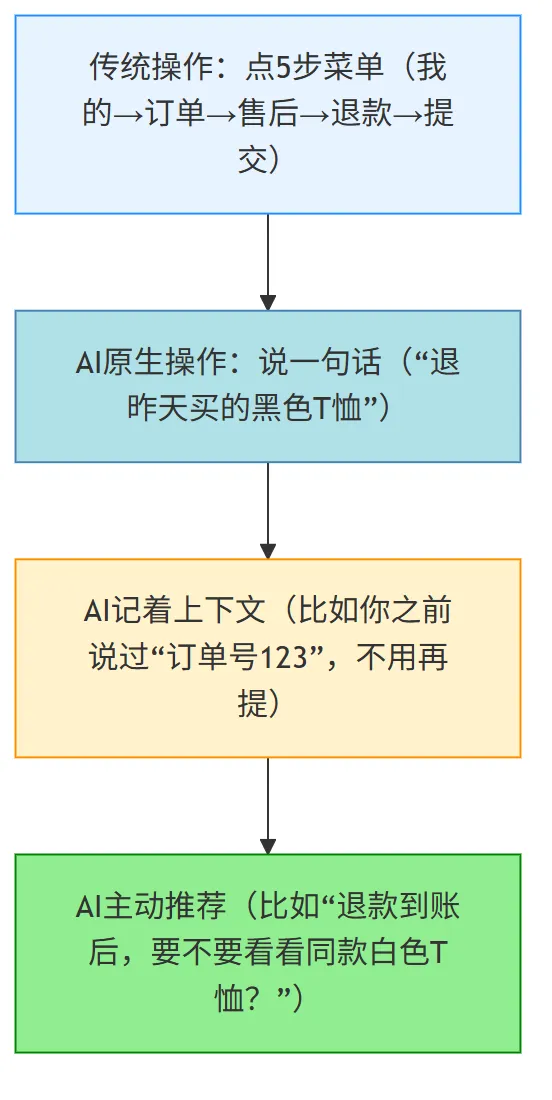 AI原生应用 是 聊天 交互,主要用嘴, AI原生应用直接“聊天”就行。比如 你说“帮我退掉昨天买的黑色T恤”,AI会自己找到订单、发起退款,不用你多操作一步。