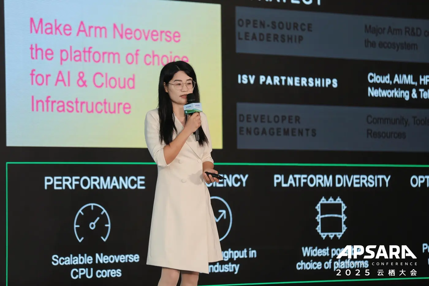 人工智能 (AI) 工作负载的加速增长,正在重塑云与数据中心基础设施的需求。效率、可扩展性以及跨生态系统的开放协作,已成为全球创新的关键驱动力。会上,安谋科技基础设施业务线总监侯科鑫以《扩展智能基础设施 —— Arm 引领云与 AI 数据中心新纪元》为题进行了分享。她重点阐述了 Arm Neoverse 平台如何赋能新一代面向 AI 的智能数据中心。Neoverse 具备行业领先的性能与能效比,以及坚实的生态系统支持,旨在加速各类云环境中的 AI 工作负载。她还强调,Arm 以开放、协作的方式支持开源的龙蜥操作系统等项目,彰显了针对异构计算构建协同且优化的软件生态系统的价值。演讲最后,她与现场在座嘉宾共同探讨了云计算的演进之路,以及如何携手 Arm 共同探索行业未来机遇。
