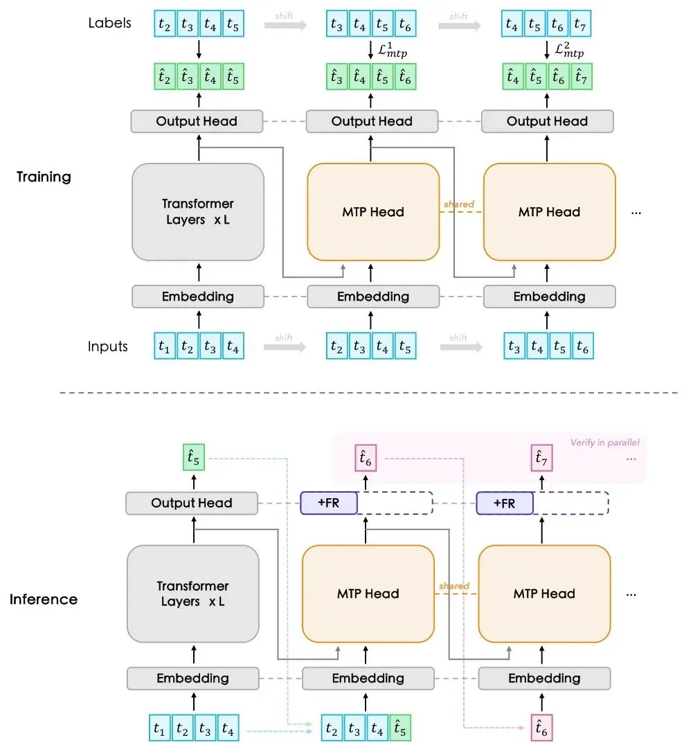 训练时,MTP头的输入是“主模型的隐藏状态+移位后的token”,递归式预测多步token: