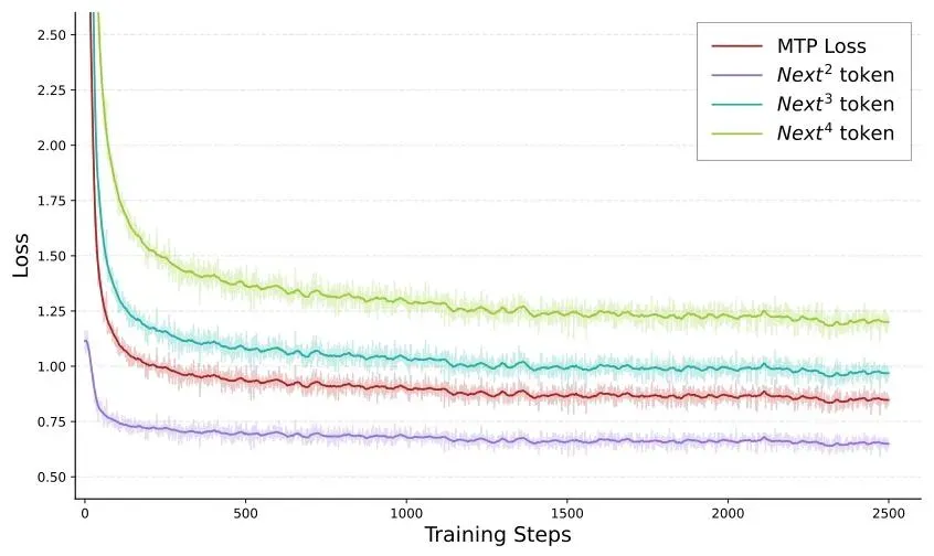 该图横轴为训练步数(0~2500),纵轴为损失值,三条曲线分别对应 MTP 头预测第 2 个 token(Next2 token)、第 3 个 token(Next3 token)、第 4 个 token(Next4 token)的损失变化。可观察到 “预测步数越远,损失越高” 的规律(Next4 token 损失始终高于 Next2 token),且所有曲线随训练步数逐步收敛,印证了 “指数衰减加权损失” 优先保证近程预测准确性的设计合理性