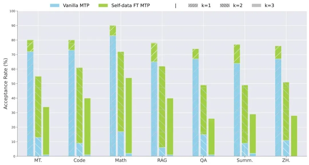 训练效果很明显:MTP头的草稿接受率大幅提升(对比传统MTP复用策略):