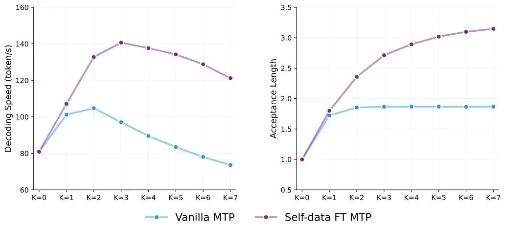 为什么要这么做?因为MTP头是给主模型当“草稿员”的——只有草稿和主模型的输出风格、逻辑一致,主模型才会多接受。如果用外部数据集的回答,风格和主模型不一样,草稿再对也会被主模型拒绝。