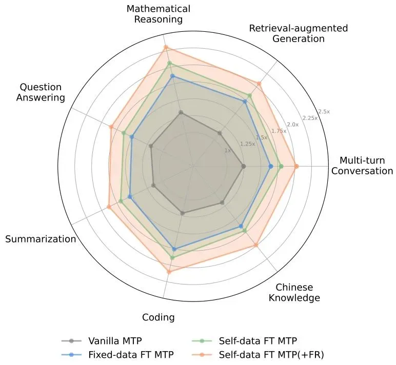 可以看到:越有规律、越结构化的任务,FastMTP提速越明显——这正好覆盖了LLM的核心应用场景(比如数学辅助、代码生成)。