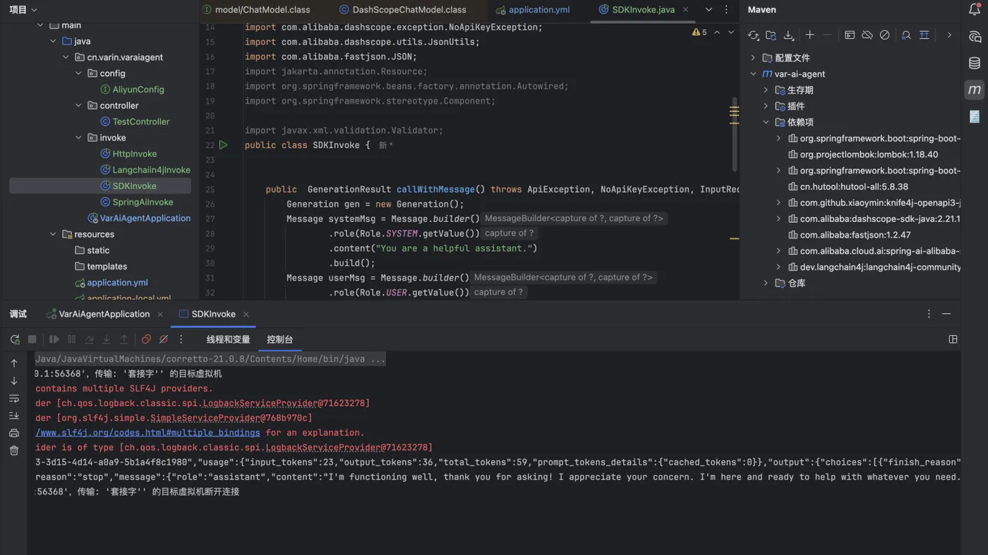 package cn.varin.varaiagent.invoke; import jakarta.annotation.Resource; import org.springframework.ai.chat.messages.AssistantMessage; import org.springframework.ai.chat.model.ChatModel; import org.springframework.ai.chat.prompt.Prompt; import org.springframework.boot.CommandLineRunner; import org.springframework.stereotype.Component; @Component public class SpringAiInvoke implements CommandLineRunner { @Resource private ChatModel dashScopeChatModel; @Override public void run(String... args) throws Exception { AssistantMessage hello = dashScopeChatModel.call(new Prompt("解释AI一词")) .getResult() .getOutput(); System.out.println(hello.getText()); } }