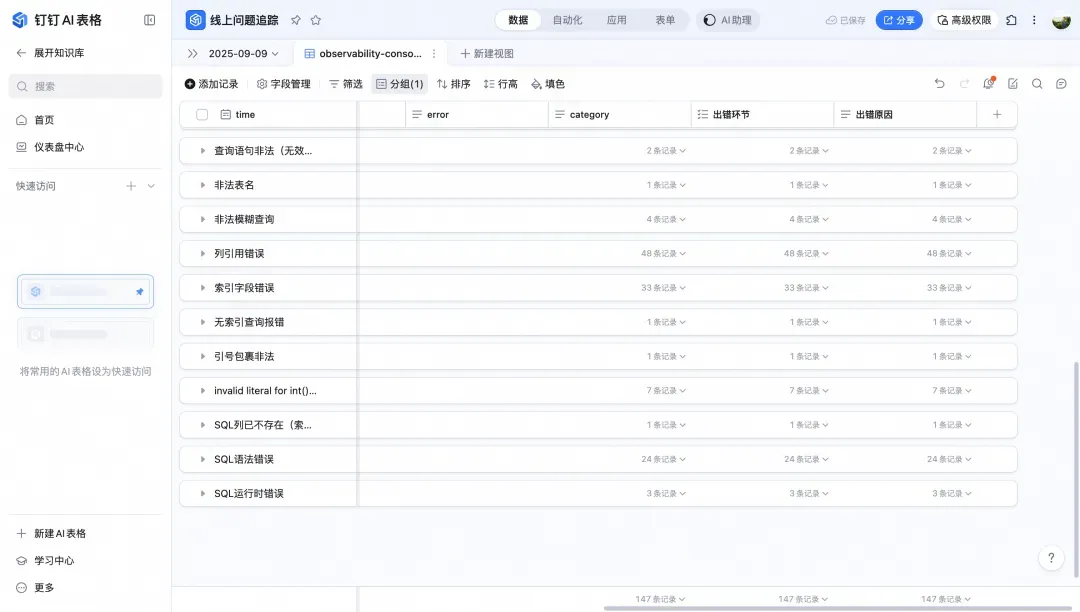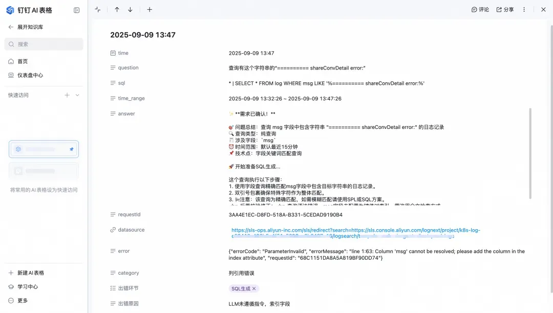 比如这里,我们将 SLS 和钉钉 AI 表格结合:利用 SLS SQL 分析能力处理海量的请求数据,整理出错误问题并有效识别错误特征(通过正则模式匹配识别,比如 case when msg like '%cannot be resolved%' then '列引用错误' ...),然后通过下载将结果数据导出,并导入钉钉 AI 表格(前身是钉钉多维表格),于是我们便可以利用 AI 表格中的诸多特性(如分组、筛选等),还可以通过表单形式进行人工审阅和标注,诊断具体问题时则直接跳转到上章所述的诊断系统中,实现请求→问题→数据的串联。