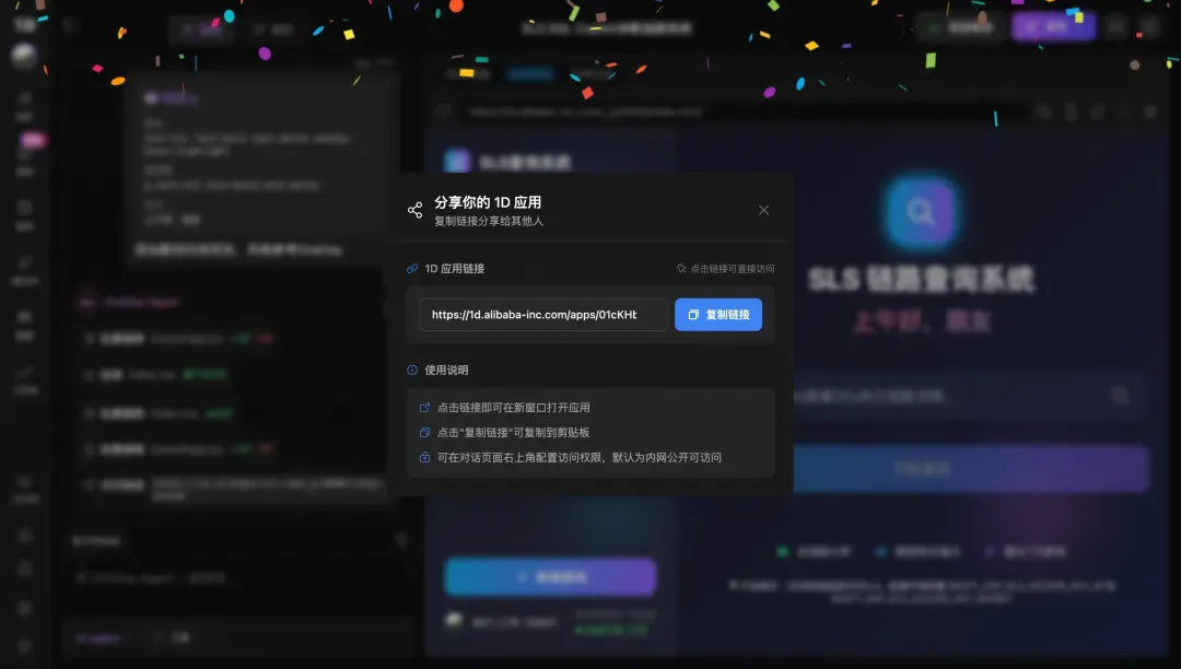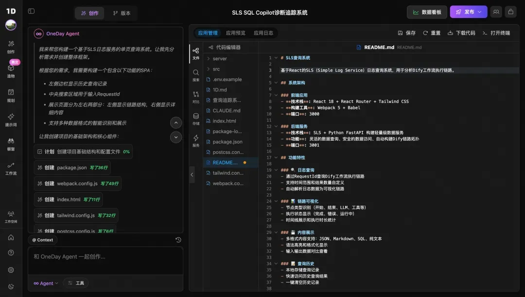 在实践中,我使用到了集团的 AICoding 平台 OneDay(阿里巴巴内部的一个基于AI的创意应用生成平台)构建前端系统,后端则直接基于 SLS 强大的数据存储、查询和处理能力。