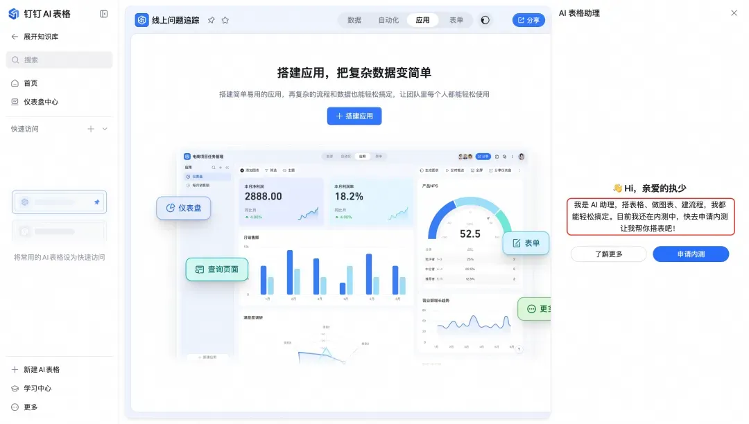 而“全面面向 AI”并不是空喊口号,钉钉已在很多 AI 平台中做了集成,包括 AI 表格本身后续也会开放 AI 助理的能力(PS:已申请内测,期待能力开放。),我们不断沉淀的数据(包括人工标注)后续能否被高效地作为 AI 的生产资料和知识使用,这是我们选择工具的逻辑和策略标准。