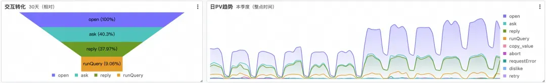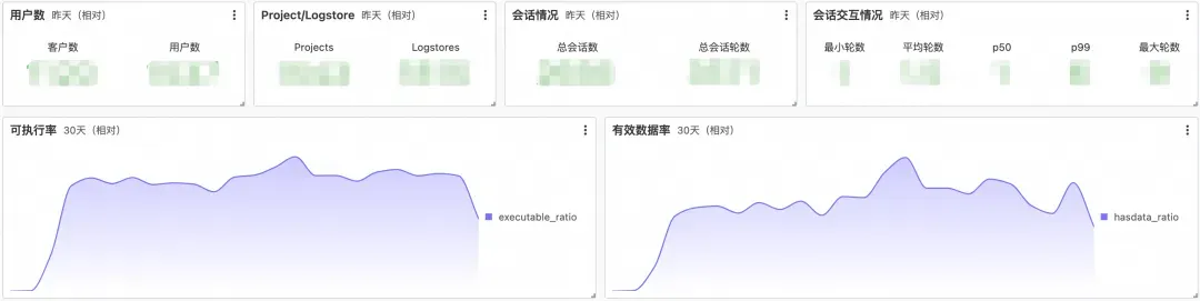 基于 SLS 的 SQL 分析和可视化能力,我们还可以为业务轻松构建黄金指标,定制运营大盘,深入洞察并分析交互留存转化、每日请求趋势变化、错误分布情况、SQL 质量监控(可执行率和有效数据率)、用户满意度监控等。