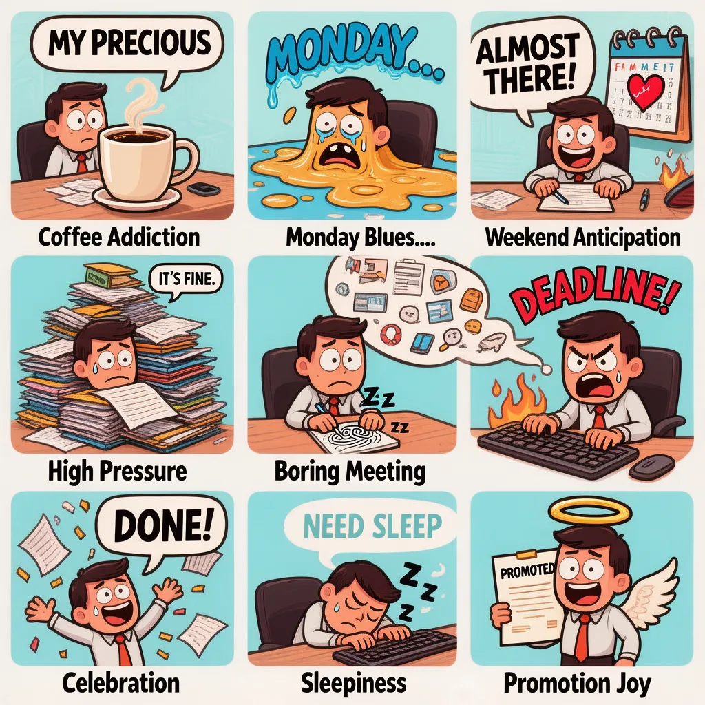 提示词:生成上班族九宫格表情包:1) 咖啡成瘾 2) 周一忧郁 3) 期待周末 4) 压力大 5) 无聊会议 6) 怒敲键盘 7) 庆祝 8) 困倦 9) 升职快乐。