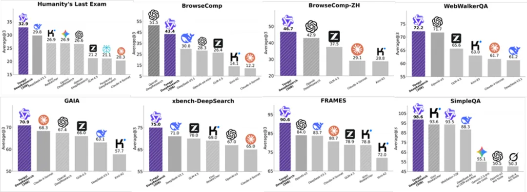 Tongyi DeepResearch 项目是 2025 年 9 月 16 日发布的开源 Web Agent 模型,实现 SOTA(最先进)性能,在 Humanity’s Last Exam (HLE) 上得分 32.9、BrowseComp 上 45.3,以及 xbench-DeepSearch 上 75.0,超越 OpenAI 的 Deep Research 等专有模型。