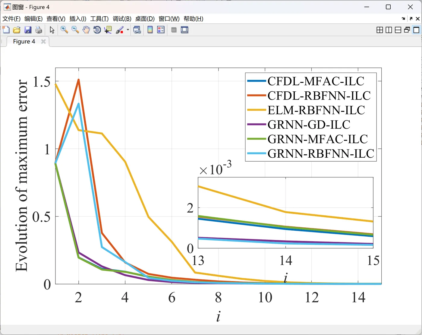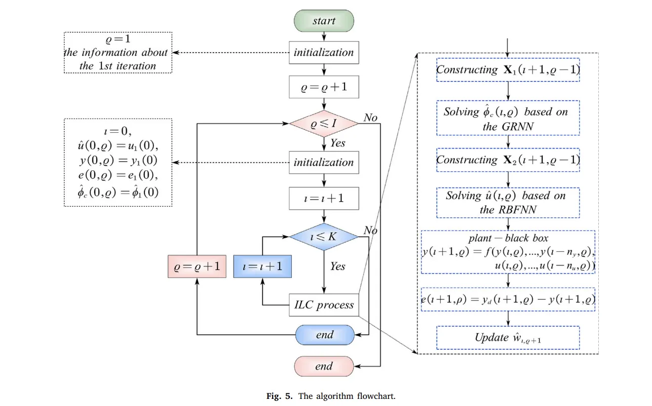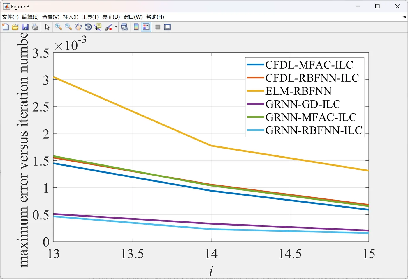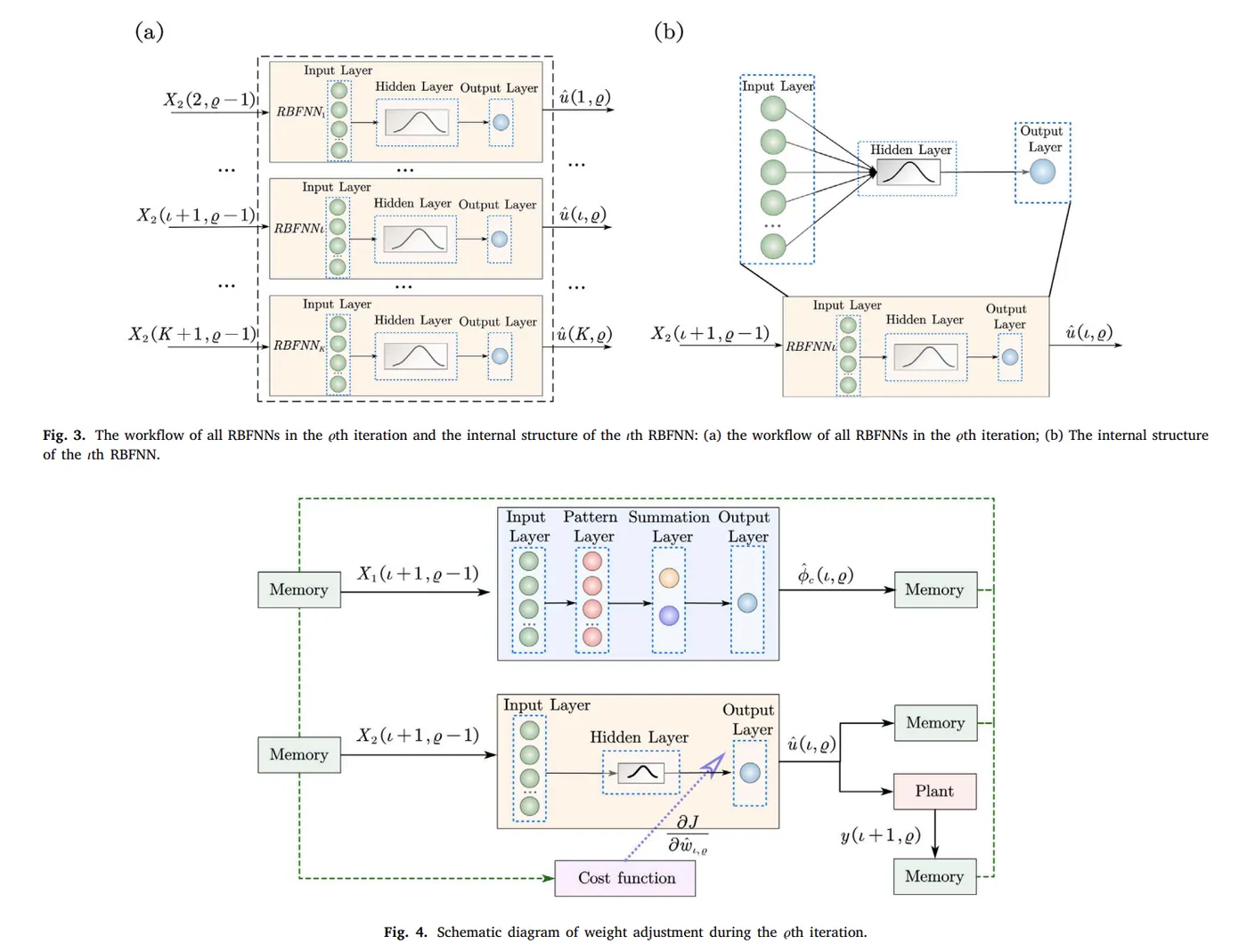 2. 利用GRNN的输出,在迭代轴上构建RBFNN的输入特征集。RBFNN直接充当控制器,并通过最小化控制输入准则函数输出最优控制输入。与传统的ILC算法相比,该算法简化了控制器的设计,并配备了RBFNNs以确保收敛。