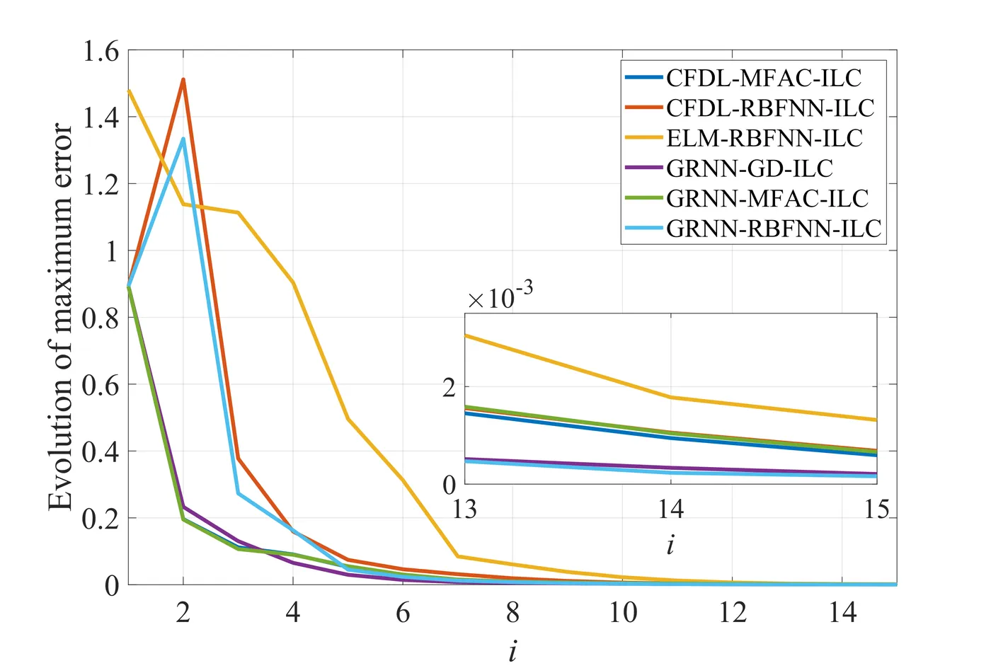 基于NN-ILC设计方法,取得了许多研究成果。Yu等人(2022b)提出了一种基于反向传播神经网络(BPNN)的ILC策略,利用BPNN描述了基于磁形状记忆合金(MSMA)的执行器中的滞后现象。Dong等人(2023)提出了一个用于车道变换的ILC框架,利用BPNN建立了交通模型。除了有效利用BPNN外,还有研究成功将RBFNNs和ELMs应用于ILC。例如,Yu等人(2021)提出了一种基于RBFNN的数据驱动ILC方法,用于未知非线性非仿射重复离散时间系统,可以通过更新RBFNN的权重矩阵来自动调整控制器增益。Li等人(2022)提出了一种基于RBFNN的数据驱动安全容错ILC算法,利用RBFNNs来抵御拒绝服务(DOS)攻击,可以通过训练RBFNNs来近似传感器失效函数。Zhou和Li(2021)提出了一种基于极限学习机(ELM)的迭代学习和优化控制方法,用于解决最优控制中的模型-系统不匹配和实时干扰问题。