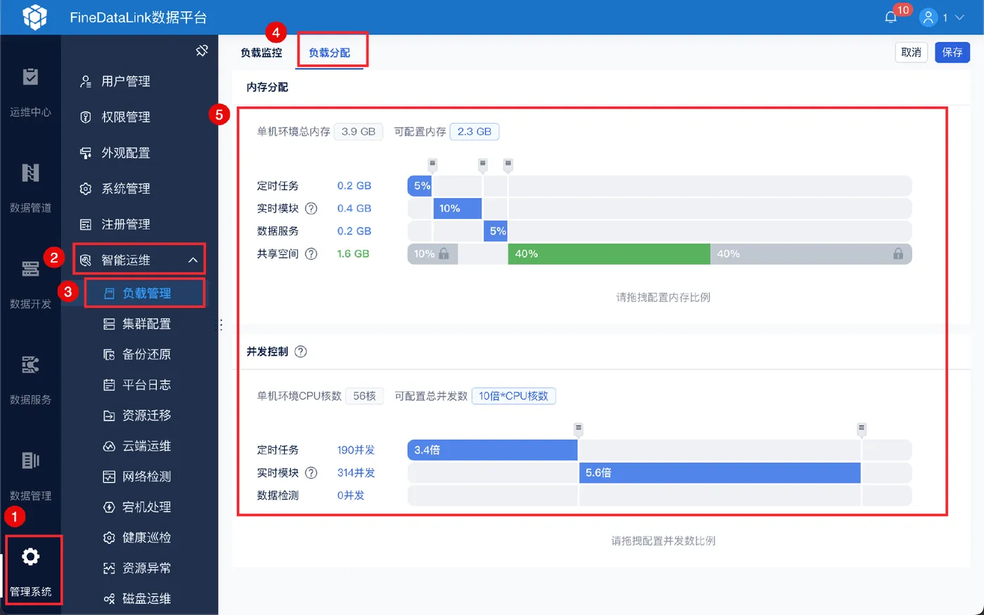 提供负载分配功能,用户在可视化界面中通过简单的拖拽,即可对定时任务、管道任务、数据服务进行独立的资源控制。