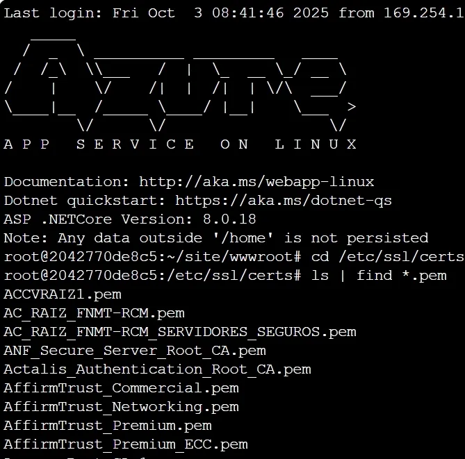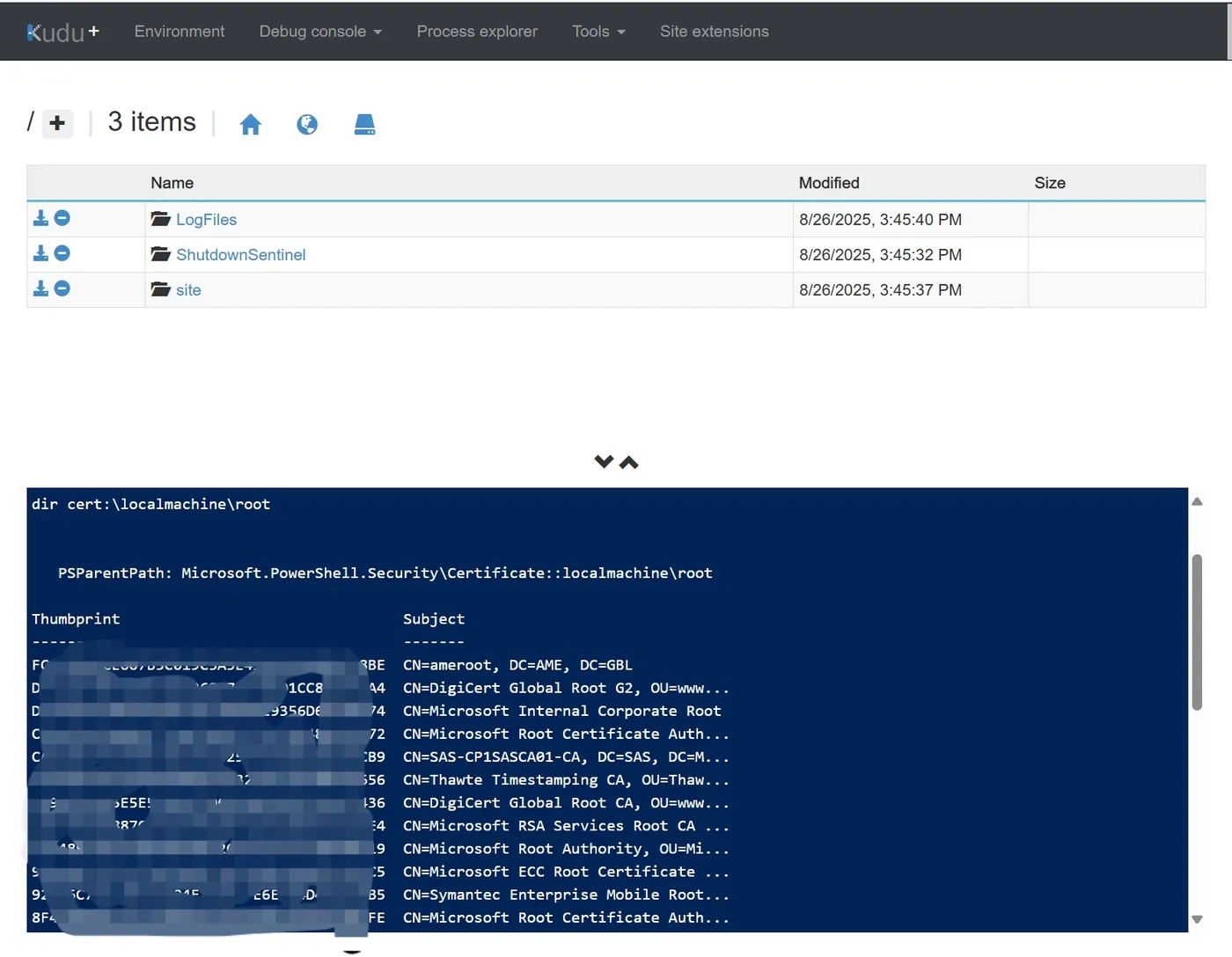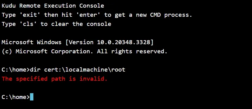 当 Azure App Service for Windows 应用尝试通过 SSL 连接到外部终结点时,外部终结点服务上的证书必须由受信任的根 CA 颁发,这一点很重要。如果外部服务上的证书是自签名证书或私有 CA 证书,则托管应用的实例将不信任该证书,并且 SSL 握手将失败并出现以下错误: