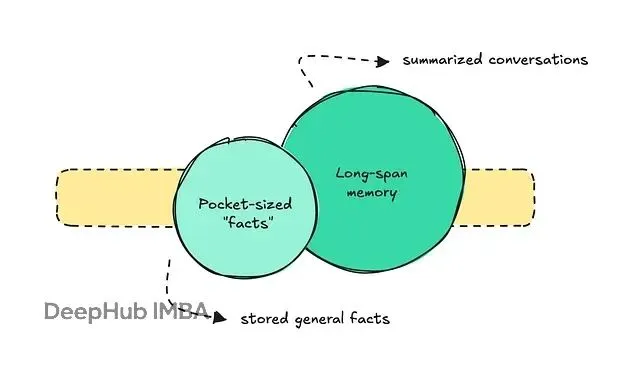 这个问题复杂到需要系统化的组织方式。业界主流做法是把长期记忆拆成两块:袖珍型事实和长跨度对话记忆。