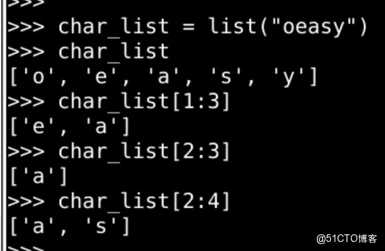 clist = list("oeasy") clist clist[1:3] clist[2:3] clist[2:4]
