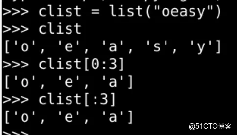 clist = list("oeasy") clist clist[0:3] clist[:3]