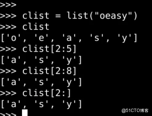 clist = list("oeasy") clist clist[2:5] clist[2:8] clist[2:]