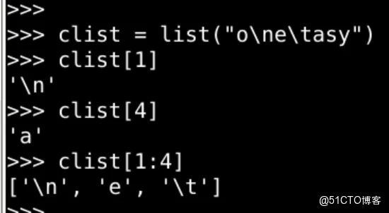 clist = list("o\ne\tasy") clist[1] clist[4] clist[1:4]