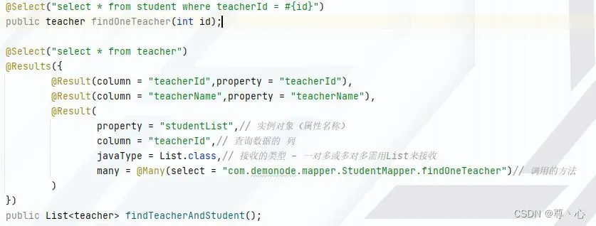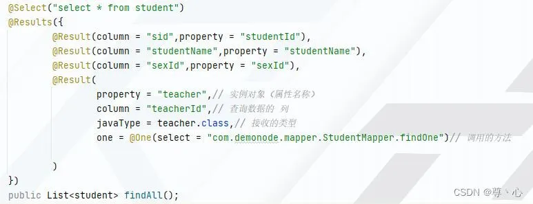 请注意,@One注解,select参数配的是方法的地址,而该方法实际上是一个单表的查询!
