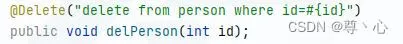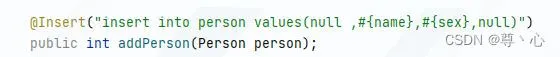 然后用@Insert注解修饰该方法,并创建对应的sql语句,那么新增就完成了 注解中,sql语句的编写,依旧可以使用#{}的方式来获得参数,其对应的名称应于POJO类中一致!