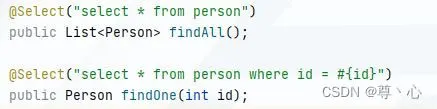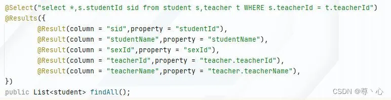 接口中的方法不变,注解也不变,添加上@Results注解,其中,该注解使用对象的方式来用最好的,也就是@Results({@Result,@Result})这样的写法。